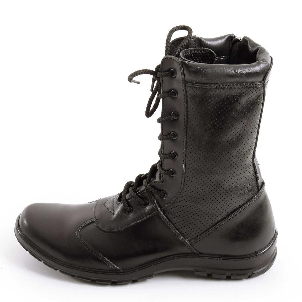 Основная часть берца изготовлена из плотной гладкой кожи, а высокая часть берца из перфорации. И вновь двойная фиксация, скоростная шнуровка и молния.
