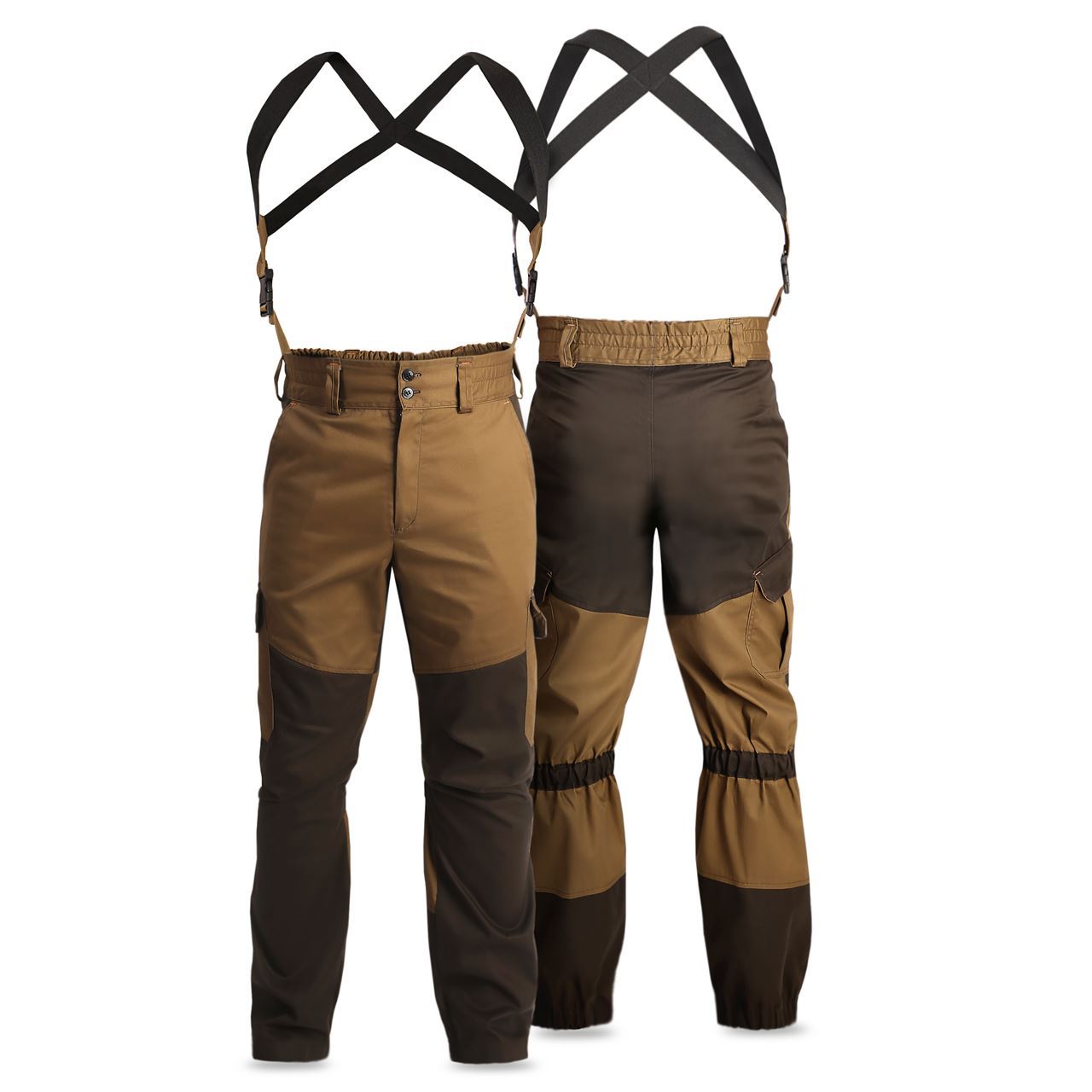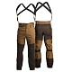 Брюки с центральной застёжкой на замок «молния» и шлевками под ремень, 2-е боковые шлёвки длиннее, для закрепления фастекса и бретелей. Бретели из помочной ленты.