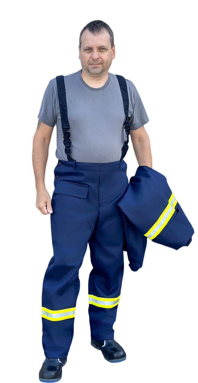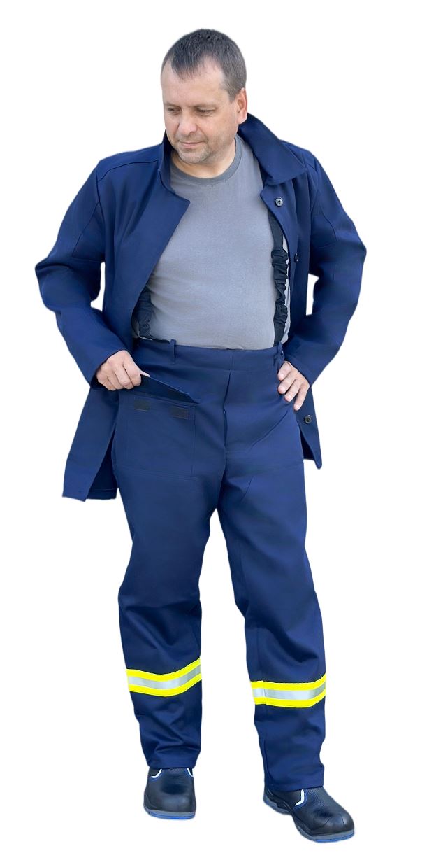 ➠ Брюки с притачным поясом, застежка гульфика на пуговицы. На правой передней половинке – накладной карман с клапаном. Передние половинки с усилительными накладками от линии бедра до низа с заходом на боковые швы. Брюки с бретелями. Нитки и фурнитура огнестойкие. По низу брюк расположен СОП 50 мм, огнестойкий.
