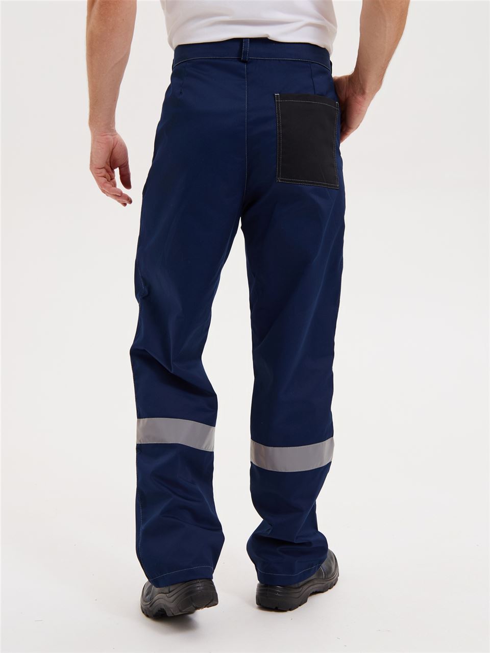 Брюки на притачном поясе. Гульфик на молнии. На передних половинках брючин имеются боковые накладные карманы с косым входом. Усиления в области коленей. На спинке объем талии регулируется при помощи резинки. Светоотражающая полоса расположена ниже колен.