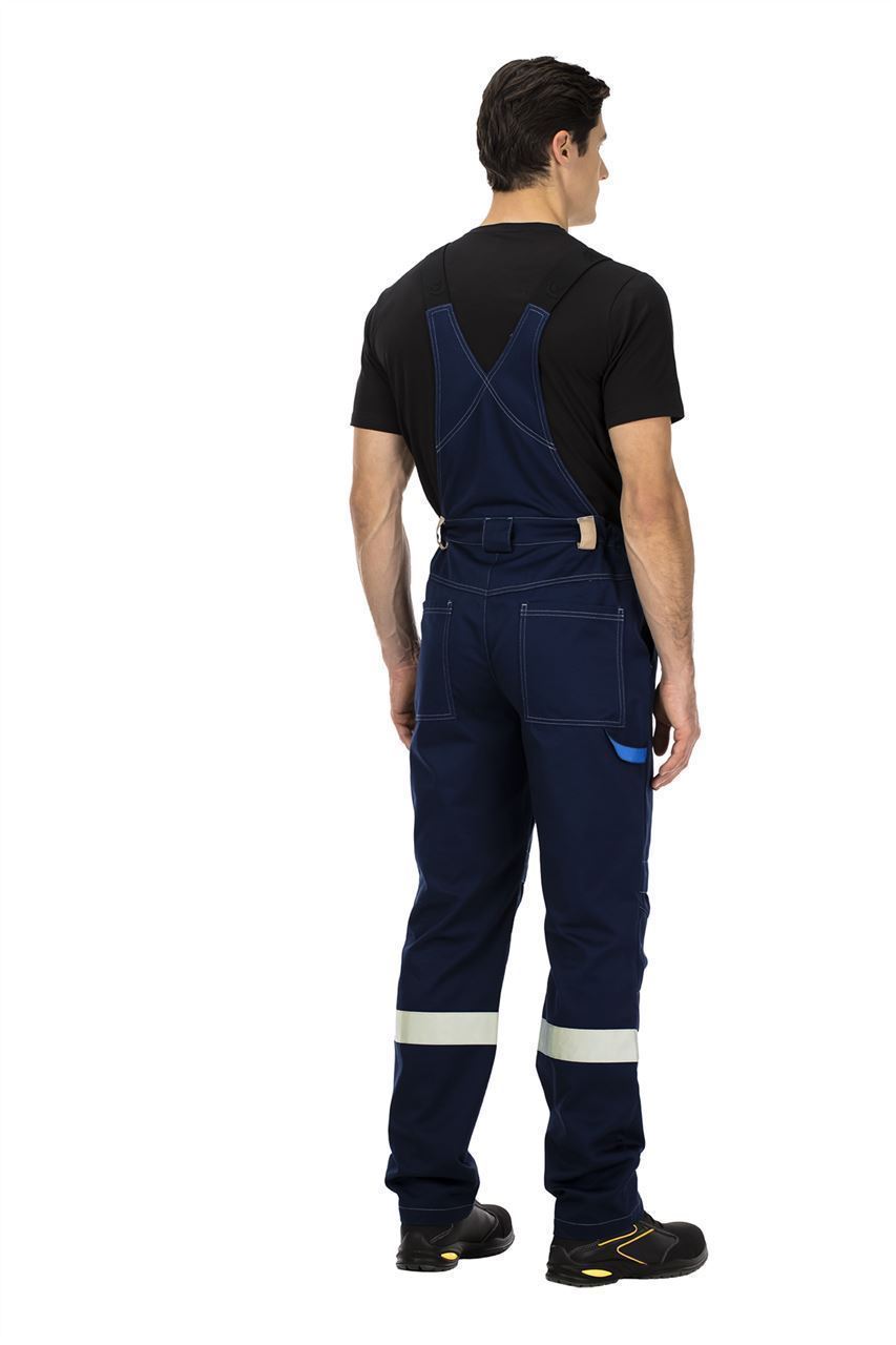 Полукомбинезон с застежкой на гульфик с молнией. Бретели с регулировкой длины из помочной резинки с пряжками. Спереди вместительный накладной карман с широким клапаном на липучке с отделами для тонких инструментов или ручек. Пояс со шлевками. Регулировка объема по талии за счет боковых вставок с эластичной тесьмой. На передних половинках - верхние карманы с боковым входом и карманы для амортизационных вкладышей в области колен на липучках. На задних половинках верхние накладные карманы, а также хлястик для инструментов.