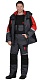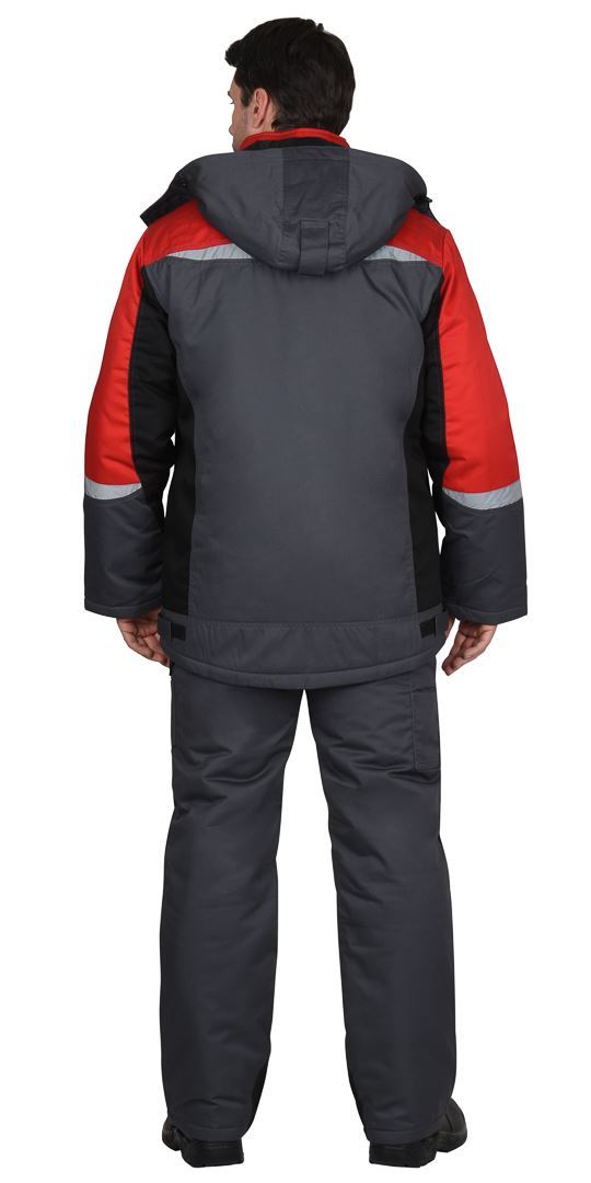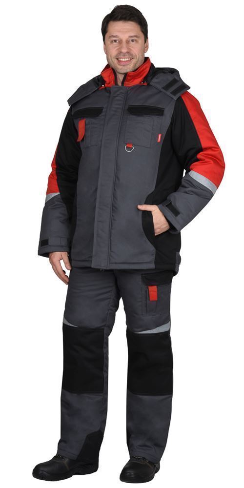 Куртка прямого силуэта, длинная, с притачной утеплённой подкладкой, с прокладкой из ткани "Лаке", с пристёгивающимся утеплённым капюшоном, с воротником стойка, с центральной застёжкой на 2-х замковую тесьму-"молнию", с ветрозащитной планкой на липучке, с подрезными бочками, с верхними фигурными карманами, с нижними прорезными карманами на "молнии". Низ регулируется при помощи хлястиков и липучки. Рукава резные, ширина внизу регулируется при помощи хлястиков и липучки. Полукомбинезон с притачной утеплённой подкладкой, с центральной потайной застёжкой на 2-х замковую тесьму "молнию", верхними накладными карманами с клапаном и нижними внутренними боковыми карманами, с наколенниками, с многофункциональным накладным карманом на левом боковом шве с клапаном и патой на ленте "контакт". На задней правой половинке один верхний и 2 нижних кармана для инструмента, настроченные один на другой, также предусмотрена шлёвка для инструмента.