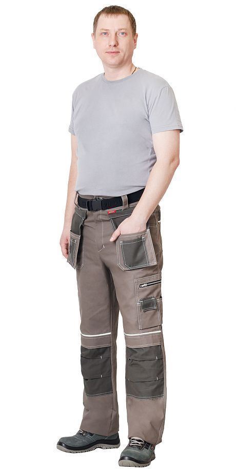 Брюки выполнены из ткани "Канвас Комфорт", прямого силуэта, с притачным поясом, с застежкой гульфика на тесьму – «молния», с различными многофункциональными карманами и объёмными наколенниками. В брюках предусмотрен ремень из резинки ременной «Сириус» застегивающийся на защелку-фастекс.