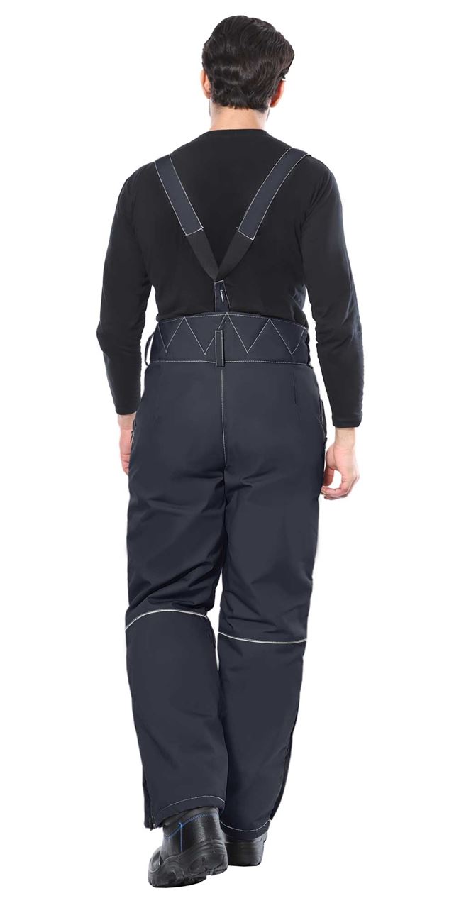 Брюки прямые на утеплённой подкладке, с застежкой спереди на гульфик с молнией. Брюки с фигурным широким поясом с застежкой на 2 пуговицы, с боковыми накладными карманами с молнией, со съёмными бретелями. По боковым швам внизу разрез с молнией. Бретели пристегиваются к брюкам при помощи пуговиц и петель, регулируются по длине защелками-фастексами.