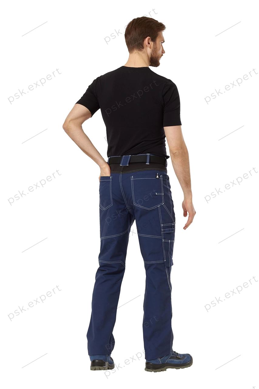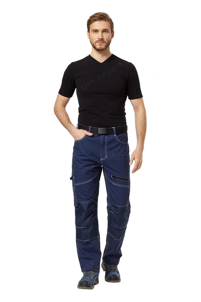 Брюки летние и демисезонные из прочной смесовой ткани темно-синего цвета с отделкой из эластичной ткани Софтшелл черного цвета, для защиты от общих производственных загрязнений.