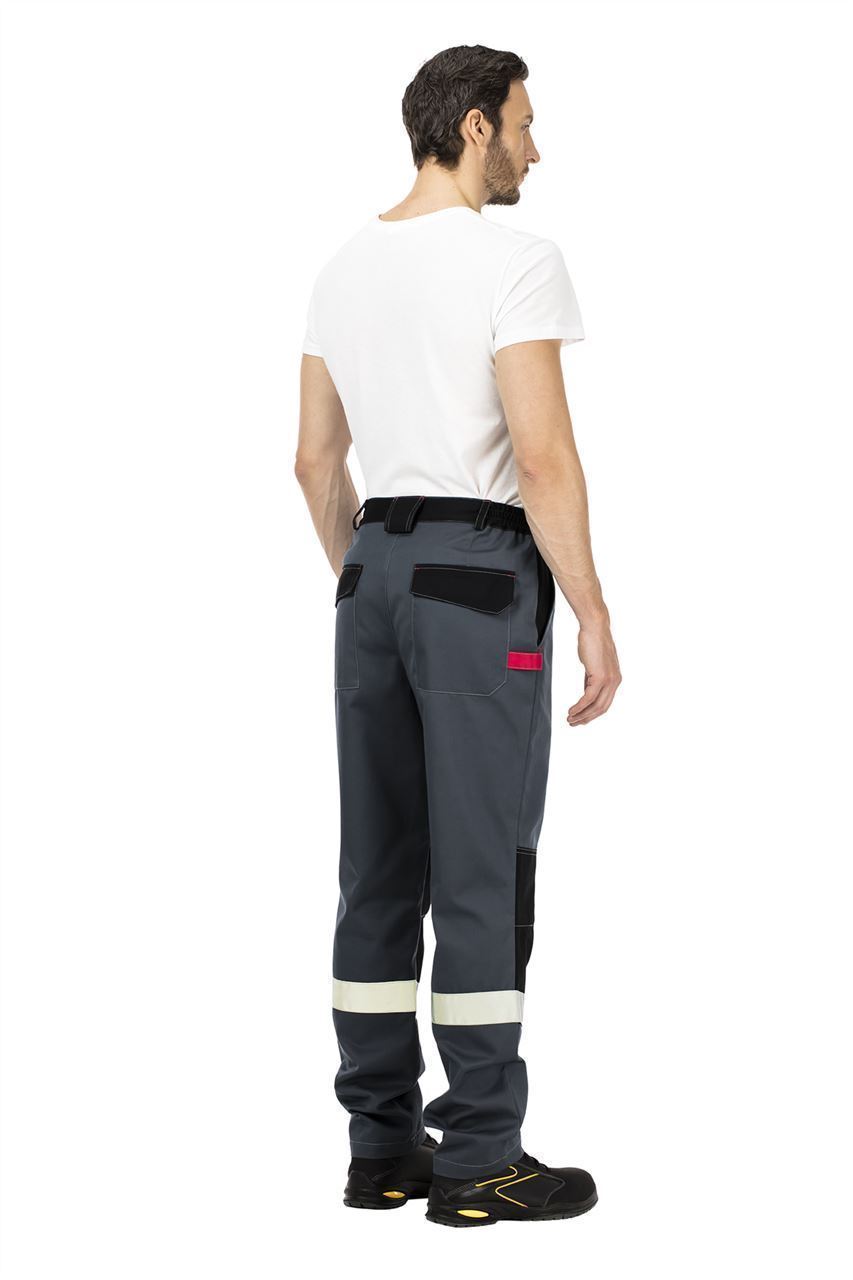 Брюки с застежкой на гульфик с молнией и пуговицей на поясе. Пояс со шлевками для ремня, одна из них из отделочного материала с пластиковым полукольцом для крепления карабина или пропуска. Регулировка объема по талии - за счет боковых вставок с эластичной тесьмой. На передних половинках верхние карманы с боковым входом. На задних половинках верхние накладные карманы с фигурными клапанами, а также петля для инструментов. В области колен - усилительные накладки.