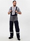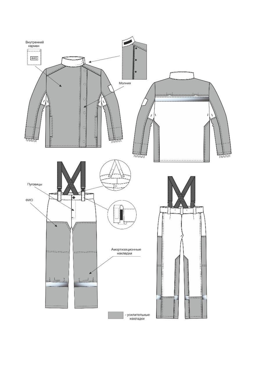 Костюм состоит из куртки и брюк со съёмными бретелями.