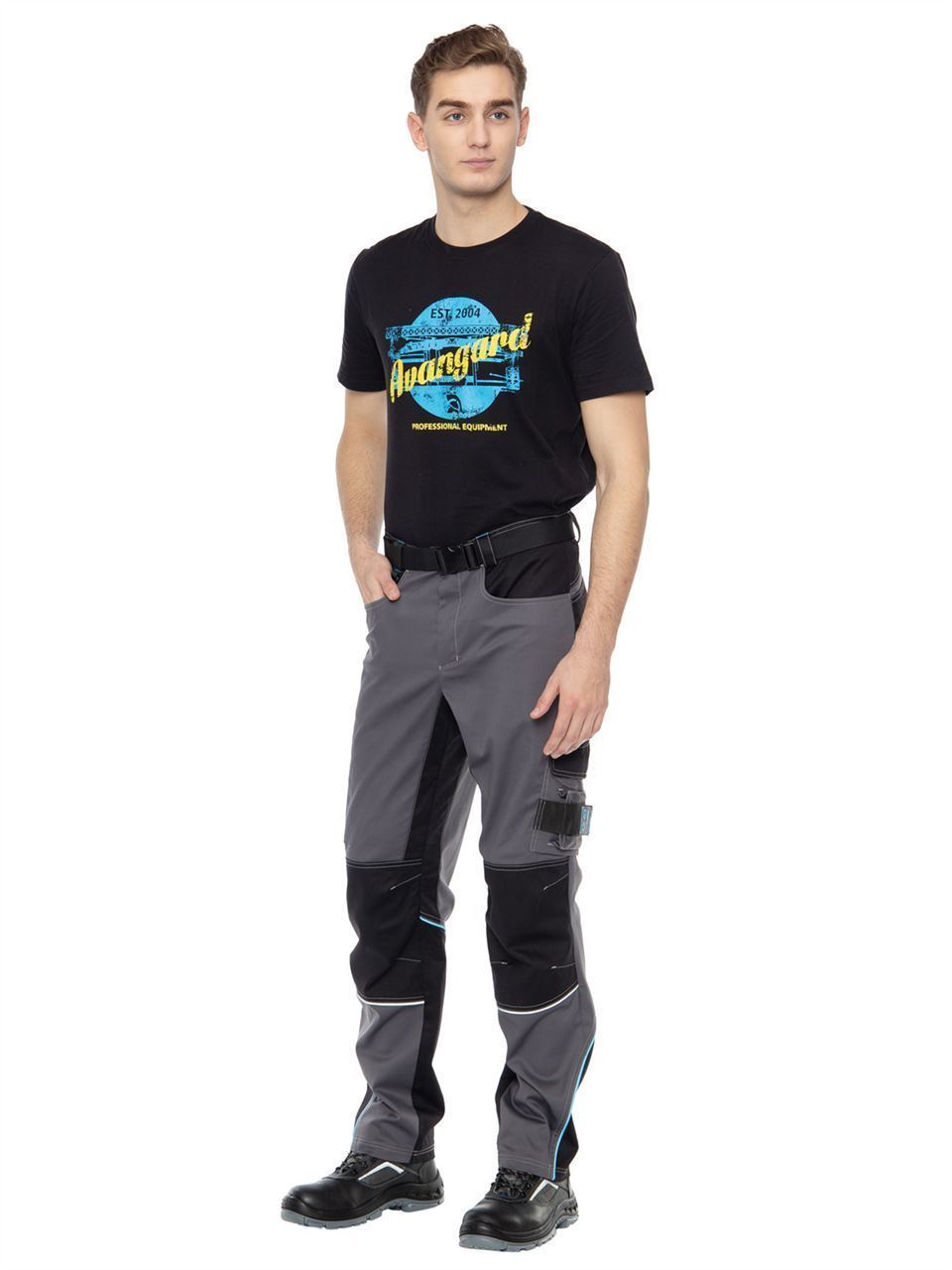 Брюки эргономичной формы с застежкой на гульфик с молнией и пуговицу на поясе. Пояс со шлевками для фиксации ремня из стропы с застежкой и с пластиковой рамкой. На передних половинках верхние боковые карманы и усилительные накладки в области колен. На задних половинках кокетки, вместительные верхние карманы. В области боковых швов брюк на уровне середины бедер расположены карманы с отделениями для средств связи и инструментов. Швы членений костюма подчеркнуты световозвращающими кантами двух цветов.