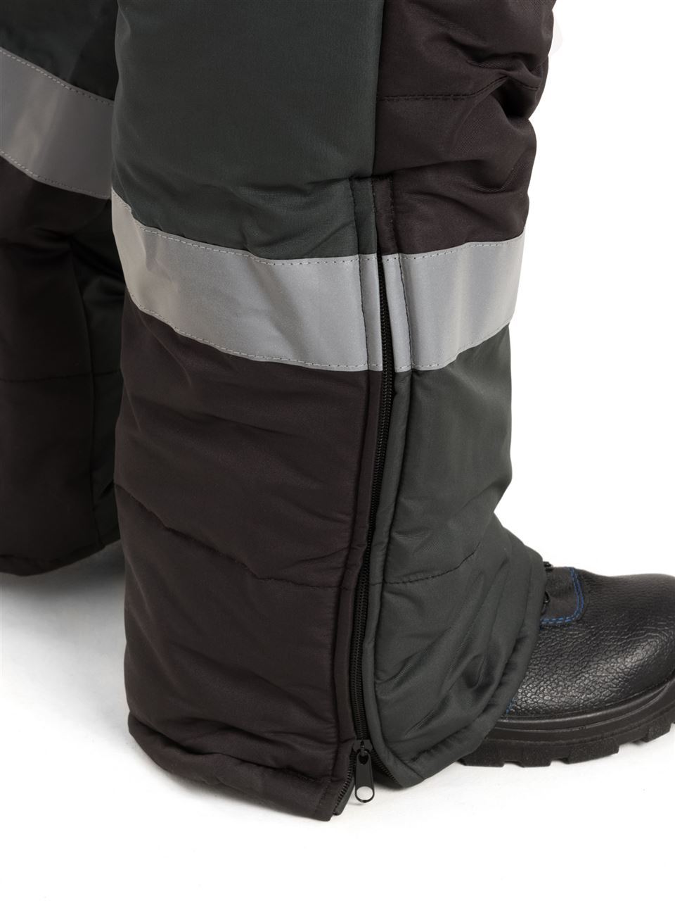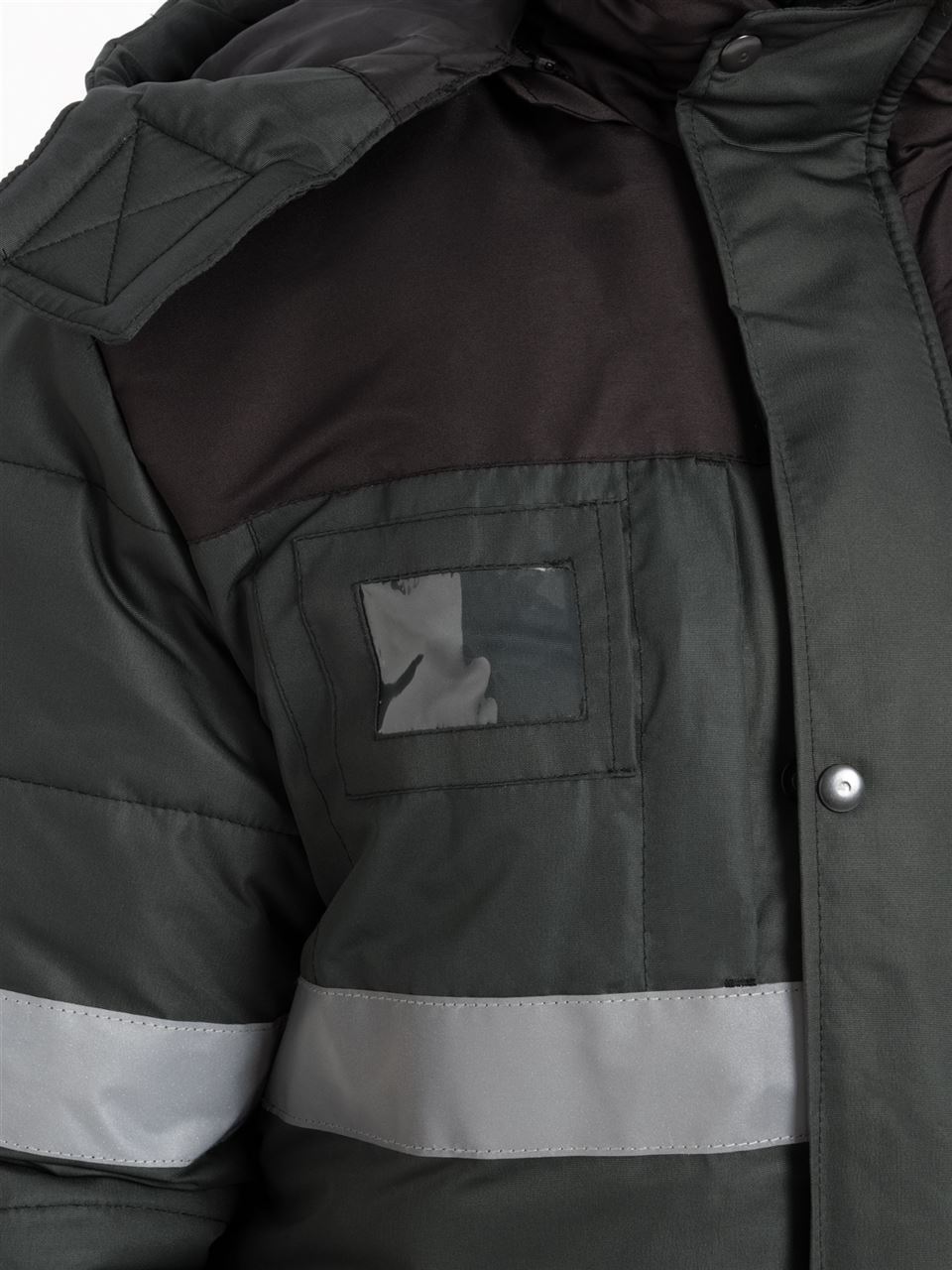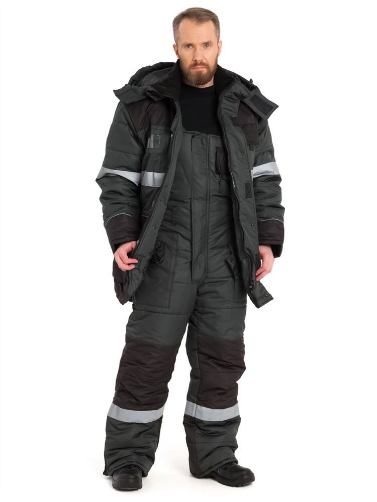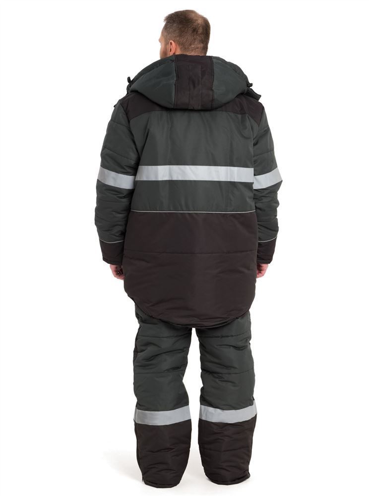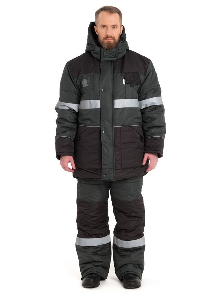 Костюм состоит из куртки и полукомбинезона. Куртка со светоотражающими полосами и кантом, с центральной застежкой на молнию, ветрозащитным клапаном на текстильную застежку с чередованием кнопок и внутреннюю планку с уголком для защиты подбородочной части от молнии. Воротник стойка, с внутренней стороны флис, съемный утепленный капюшон. На правой полочке нагрудный карман для бейджа. Рукава с внутренними трикотажными манжетами. Полукомбинезон со светоотражающими полосами , с центральной застежкой на молнию и планку на текстильную застежку, на регулируемых по длине бретелях. На правой передней половинке нагрудный карман для сотового телефона. На спинке, по линии талии в области боковых швов, кулиса.