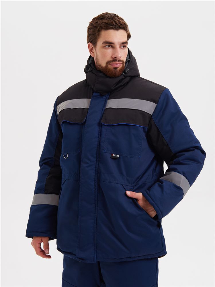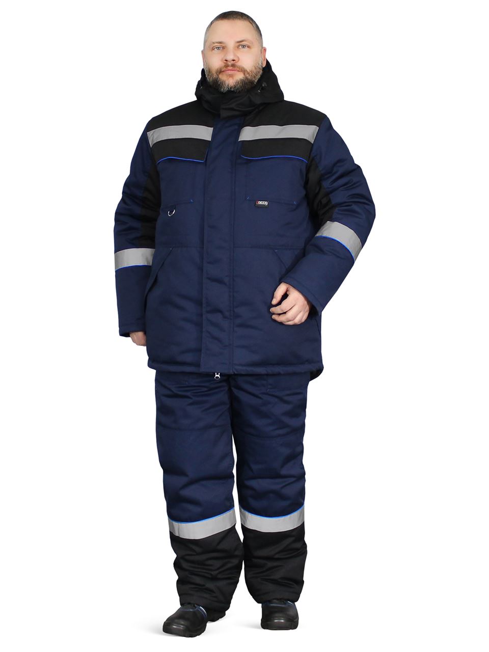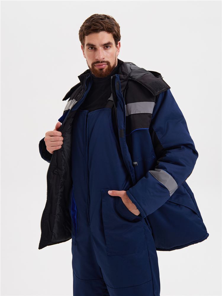 Костюм состоит из куртки и полукомбинезона. Подкладка костюма усилена ветрозащитной тканью. Куртка с центральной застежкой – “молнией”, закрытой ветрозащитной планкой на липучках. Нагрудные карманы закрыты клапаном на липучках. Объёмные нижние накладные карманы с клапанами на липучках. Под левым нагрудным карманом полукольцо для крепления пропуска. Рукава с манжетами из мягкого трикотажа. Воротник утепленный на подкладке из флиса. Капюшон съемный, на молнии, с регулировкой объема. Спинка с удлиненным низом. Внутри куртки карман для телефона и небольших документов. По талии куртки кулиса для регулировки. Полукомбинезон с центральной застежкой на двухзамковую молнию. Бретели из эластичной резинки с регулировкой длины и с застежкой - фастекс. Спереди объемные накладные карманы с боковым входом. На спинке - эластичная тесьма для регулировки объема по талии. На кокетках спереди и спинке куртки, по низу рукавов, по низу брюк полукомбинезона расположен СОП шириной 50мм и канты контрастного цвета.