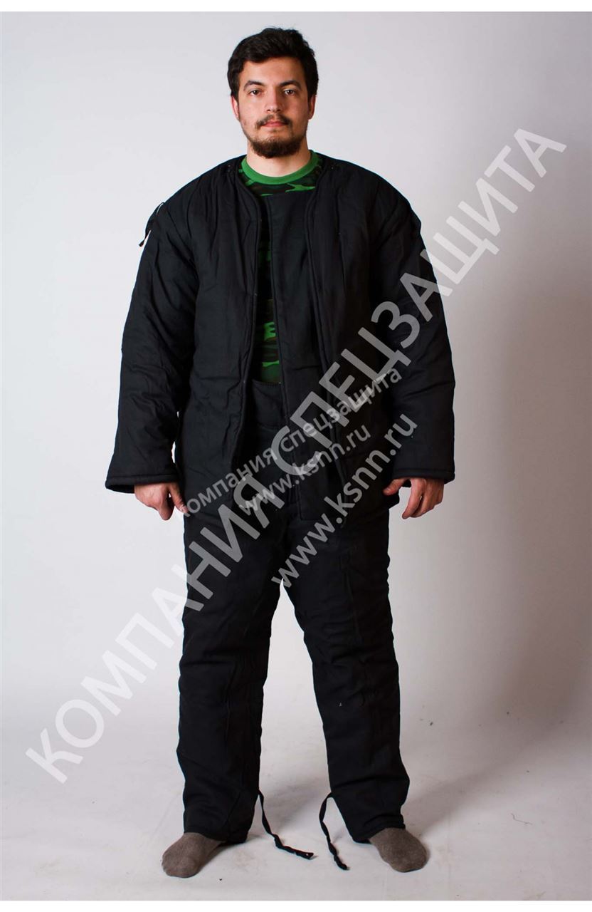 -Пристегивающаяся подкладка брюк с отрезным расширенным поясом, с центральной застежкой «гульф» на петли и пуговицы, втачными бретелями, которые регулируются по длине при помощи петель и пуговиц. Ширина брюк регулируется по низу хлопчатобумажной тесьмой. Утепляющая подкладка пристегивается к брюкам на прорезные обметанные петли и пуговицы по поясу задних половинок. Задние и передние половинки брюк с двумя слоями утеплителя, пояс с одним слоем.