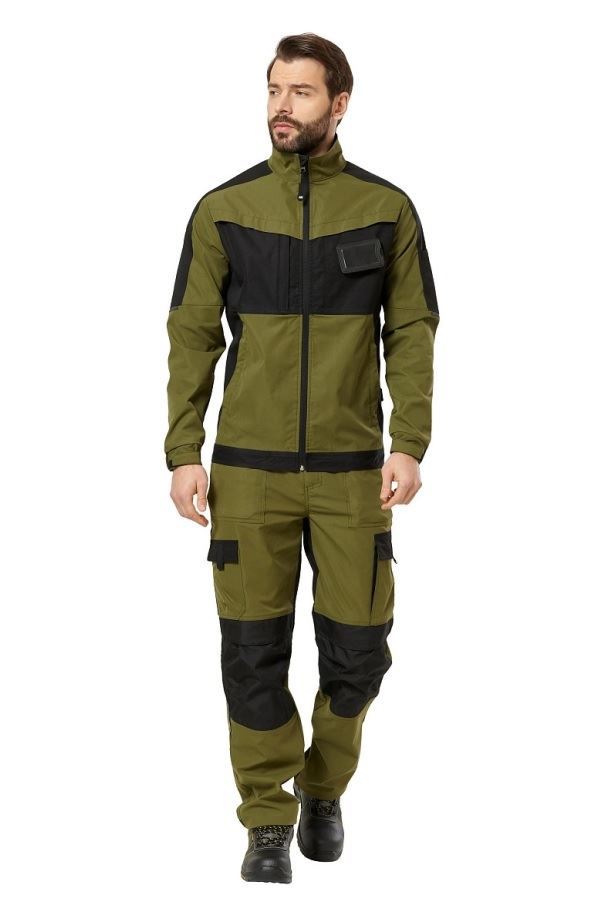 Куртка летняя и демисезонная из плотной смесовой ткани сдержанного цветового сочетания хаки и черного, для защиты от общих производственных загрязнений.