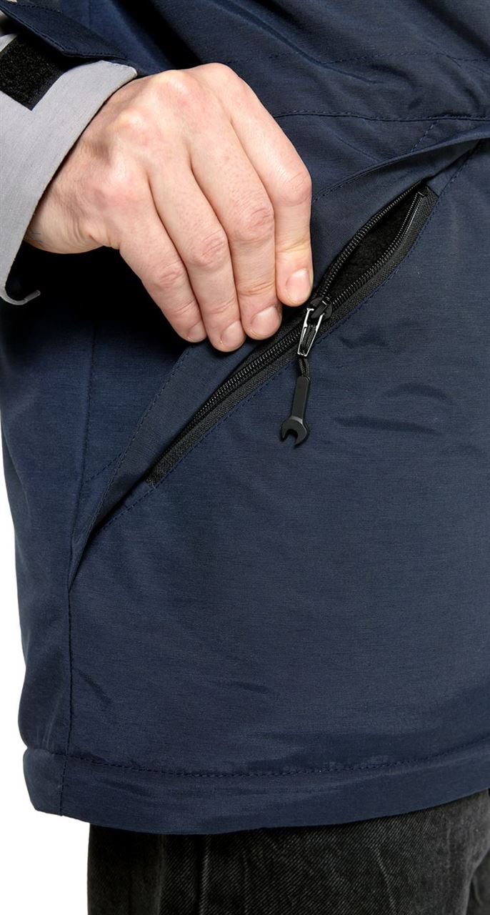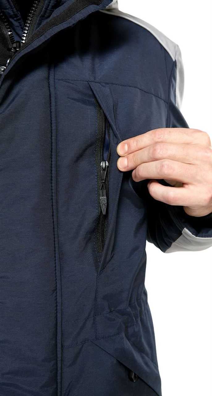 Со стороны подкладки утепленной мужской куртки расположены 2 больших кармана: один с эластичным верхом для шапки, перчаток, папки А4; второй - на молнии с внутренним карабином для ключей на тесьме.