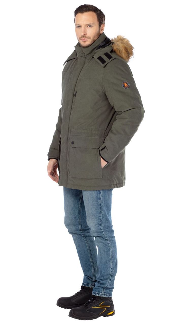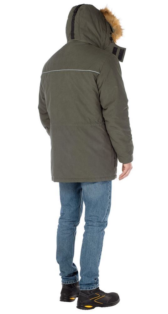 Капюшон съемный, на молнии, с двойной регулировкой объема по лицевому вырезу и по затылочной части на тесьму и кнопки. Съемная опушка на капюшоне из искусственного меха. Возможность увеличить глубину капюшона за счет отворота для защиты от метели и ветра.