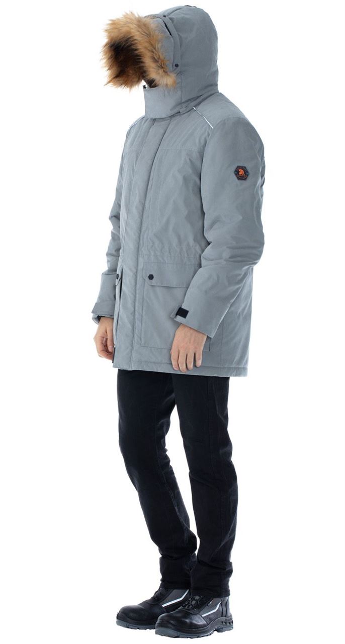 Капюшон съемный, на молнии, с двойной регулировкой объема по лицевому вырезу и по затылочной части на тесьму и кнопки. Съемная опушка на капюшоне из искусственного меха. Возможность увеличить глубину капюшона за счет отворота для защиты от метели и ветра.