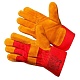 Спилковые комбинированные перчатки. Сшиты из спилка КРС оранжевого цвета высшего сорта и плотной красной ткани, прошиты прочными нитями. Дополнительные накладки в районе ногтевых пластин и костяшек тыльной стороны ладони защищают эти места от травм.