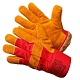 Спилковые комбинированные перчатки. Перчатки сшиты из спилка КРС темно-оранжевого цвета и плотной ткани красного цвета, прошиты прочными нитями, утеплены искусственным мехом типа "мутон". Дополнительные накладки в районе ногтевых пластин и костяшек тыльной стороны ладони защищают эти места от травм.
