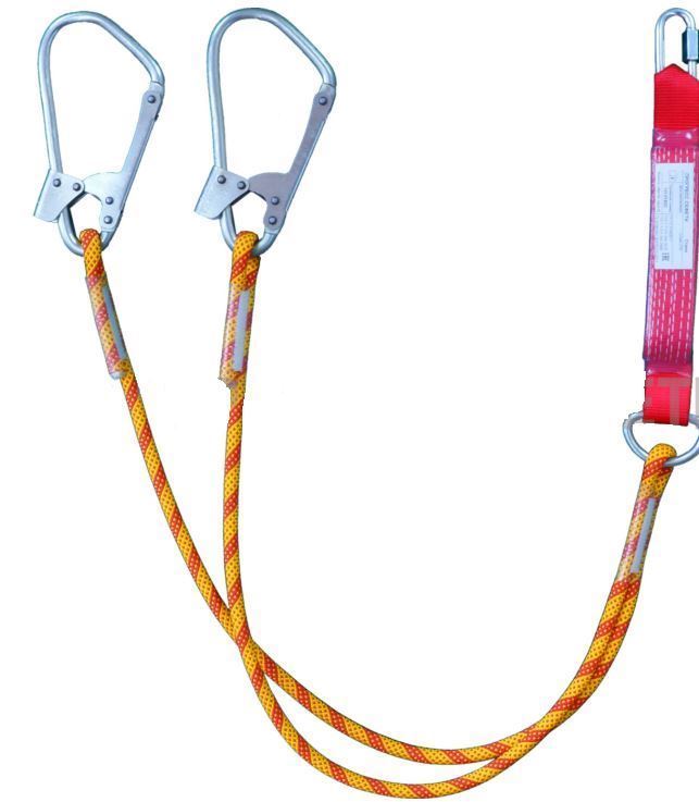 Страховочный строп, двойной (двуплечий) из полиамидного каната с амортизатором, двумя большими монтажными и одним соединительным карабином.