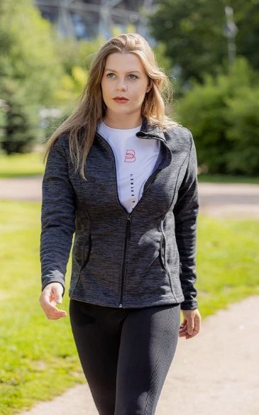 Крой модели учитывает особенности женской анатомии. Все швы плоские и эластичные, что увеличивает комфорт в повседневной носке. Толстовка застёгивается на молнию. Сверху на воротнике предусмотрен небольшой клапан, предотвращающий соприкосновение подбородка или шеи с застёжкой. В двух боковых карманах можно погреть руки или хранить необходимые для быстрого доступа вещи.