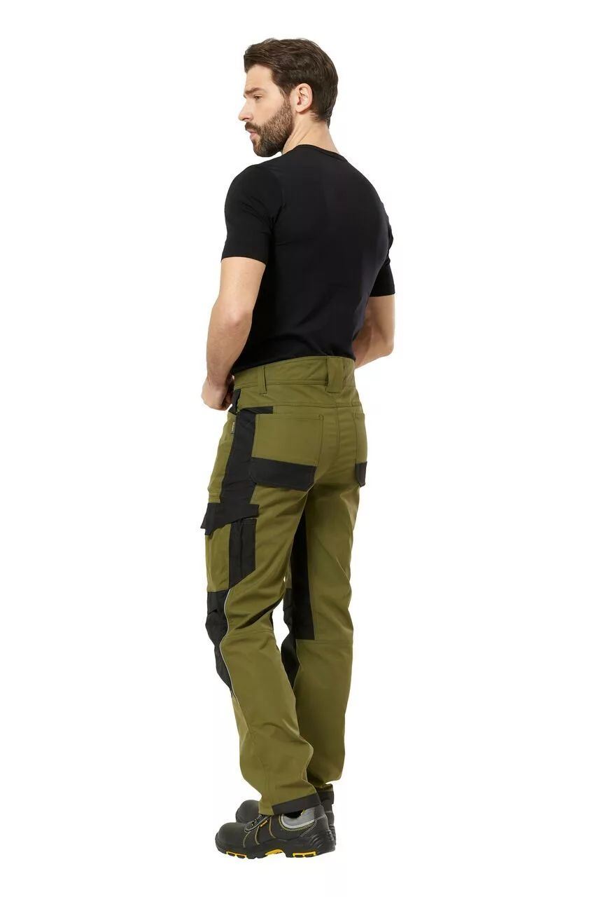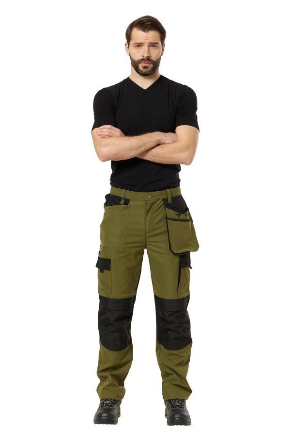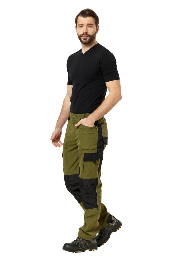 Брюки летние и демисезонные из плотной смесовой ткани сдержанного цветового сочетания хаки и черного, для защиты от общих производственных загрязнений.