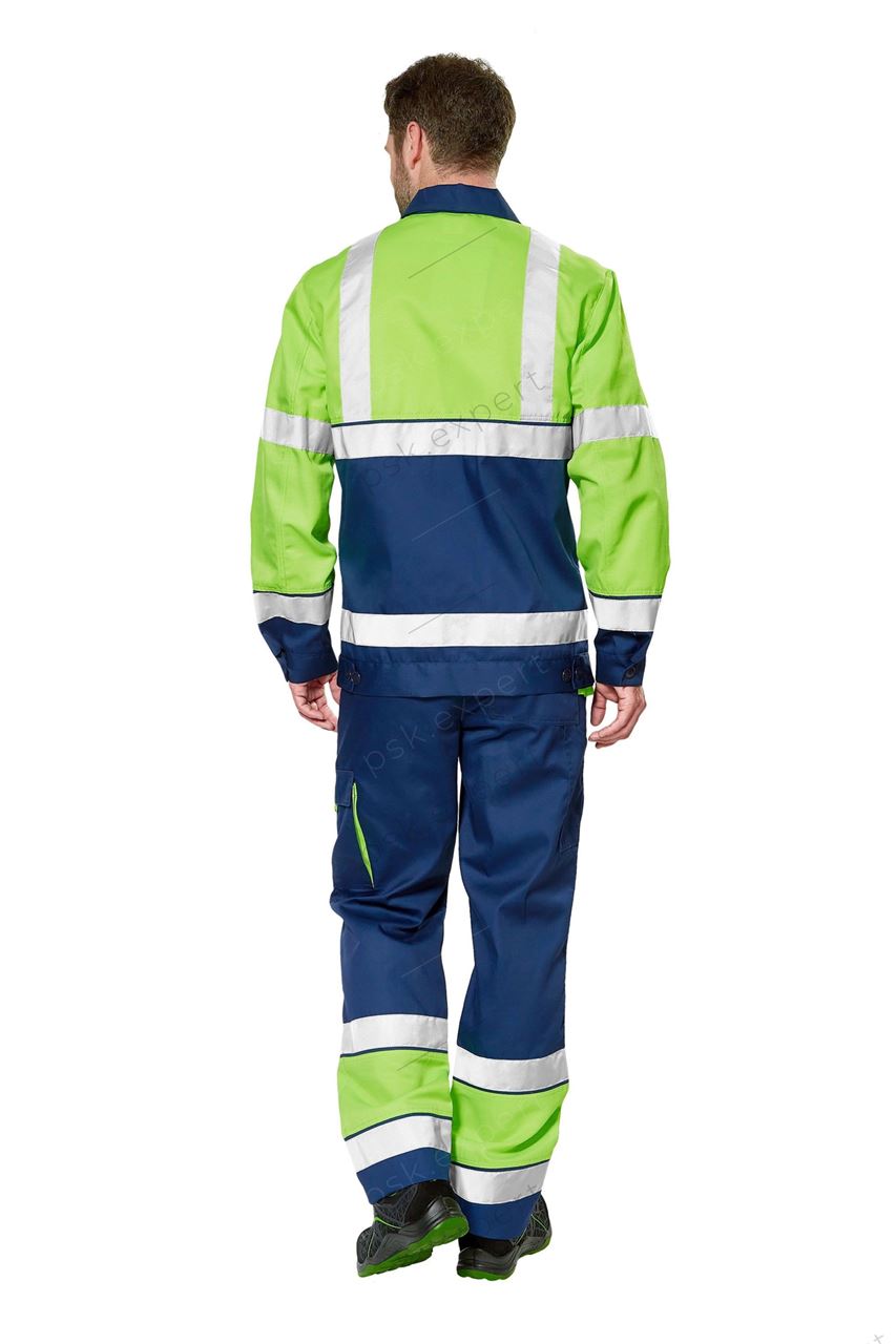 Костюм - куртка и брюки для защиты от общих производственных загрязнений в различных отраслях промышленности и в качестве сигнальной спецодежды повышенной видимости, для визуального обозначения присутствия носящих ее людей, при дневном освещении и ночью в свете автомобильных фар.