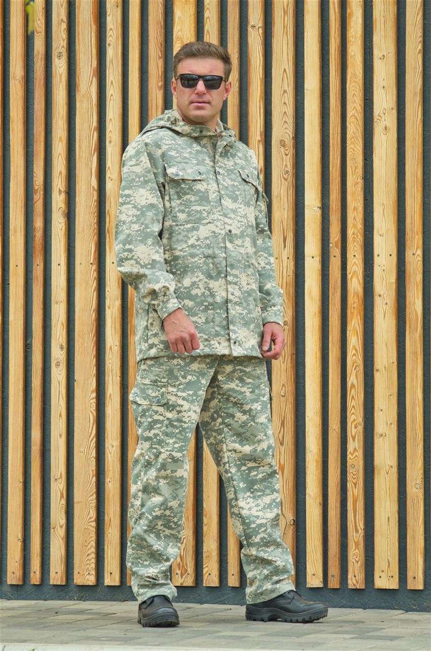 Костюм состоит из куртки и брюк, выполненных в светло-сером камуфляжном цвете, которые идеально сочетаются с окружающей природой. Куртка имеет удобные карманы на груди и плечах, где можно хранить мелочи и необходимые в лесу предметы.