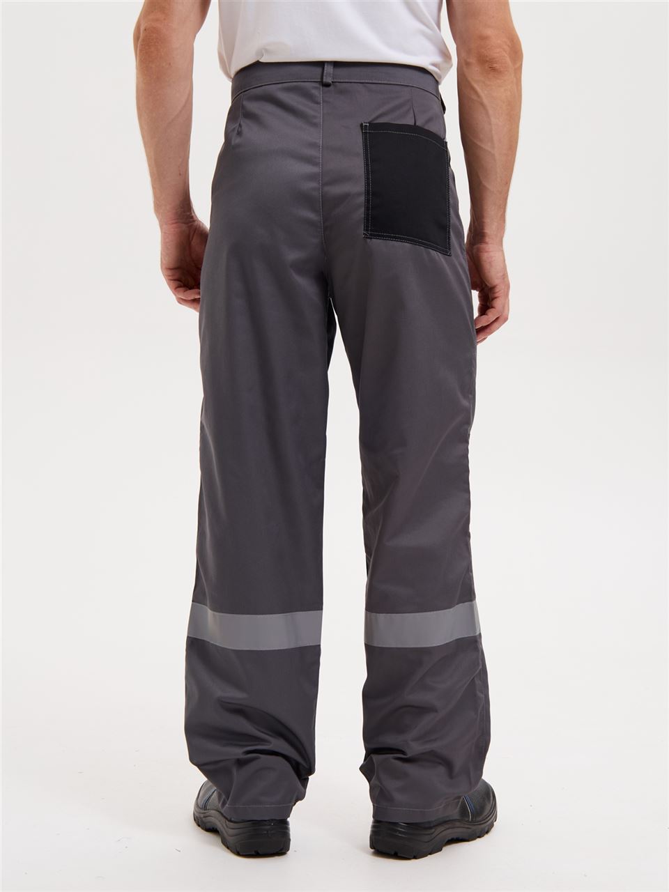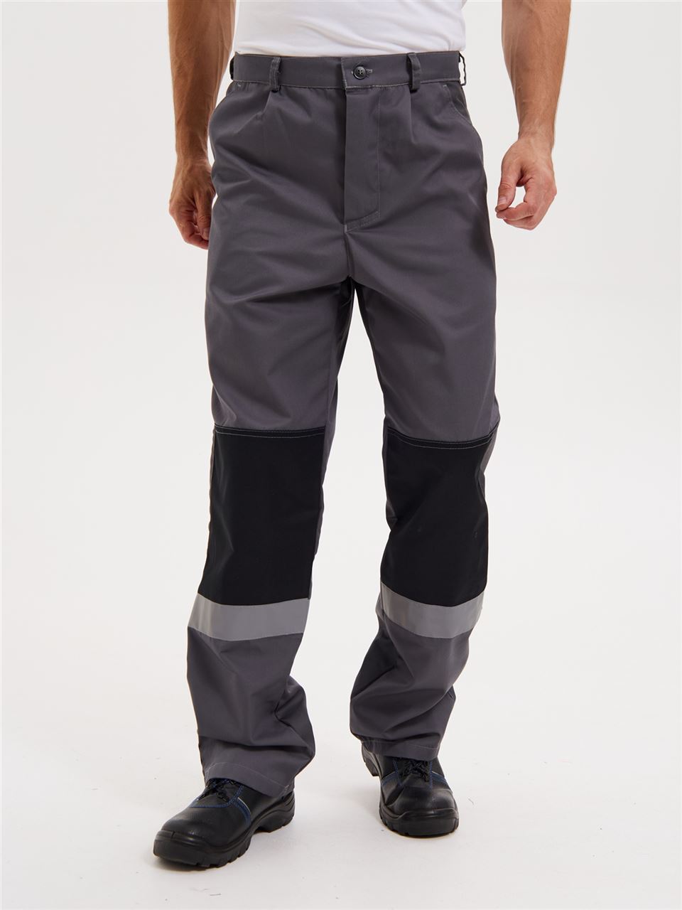 Брюки на притачном поясе. Гульфик на молнии. На передних половинках брючин имеются боковые накладные карманы с косым входом. Усиления в области коленей. На спинке объем талии регулируется при помощи резинки. Светоотражающая полоса расположена ниже колен.