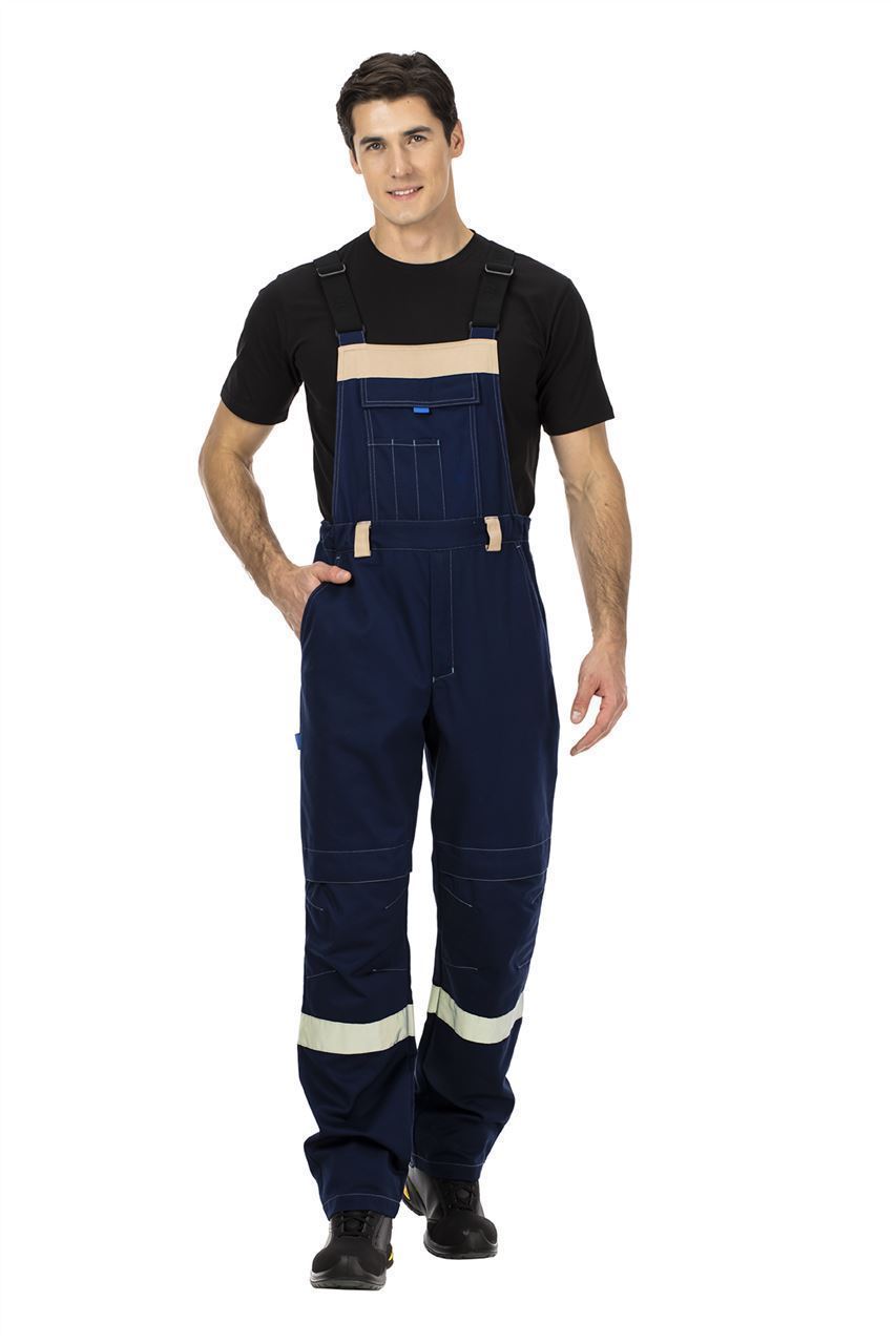 Полукомбинезон с застежкой на гульфик с молнией. Бретели с регулировкой длины из помочной резинки с пряжками. Спереди вместительный накладной карман с широким клапаном на липучке с отделами для тонких инструментов или ручек. Пояс со шлевками. Регулировка объема по талии за счет боковых вставок с эластичной тесьмой. На передних половинках - верхние карманы с боковым входом и карманы для амортизационных вкладышей в области колен на липучках. На задних половинках верхние накладные карманы, а также хлястик для инструментов.