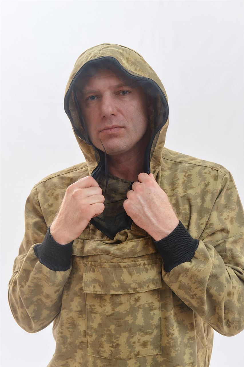 Противоэнцефалитный костюм предназначен для защиты от вредных биологических факторов (насекомых: клещей, комаров) при нахождении на открытом воздухе. В костюме предусмотрены складки-ловушки для насекомых на спинке, полочке и рукавах, а также на нижней части брюк. Изготовлен смесовой ткани. По лицевому вырезу капюшона съемная вставка из противомоскитной сетки на молнии.