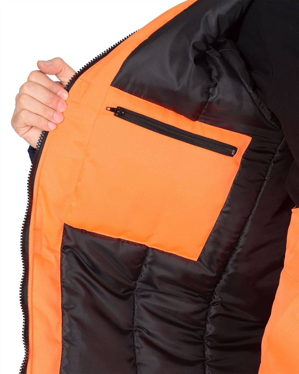 Костюм зимний, утеплённый, состоит из удлинённой куртки и полукомбинезона. Костюм двухцветный, основная ткань сигнальная повышенной видимости, также предусмотрена светоотражающая полоса мелкодисперсная белая ш.50 мм, что обеспечивает видимость рабочего при любом освещении.