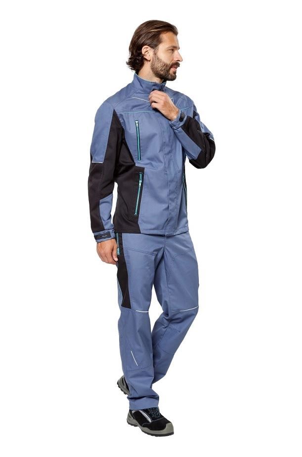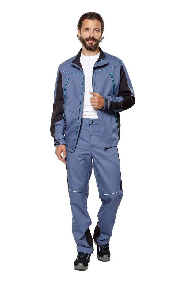 Костюм - куртка и брюки из прочной ткани с влагоустойчивой и малосминаемой обработкой.