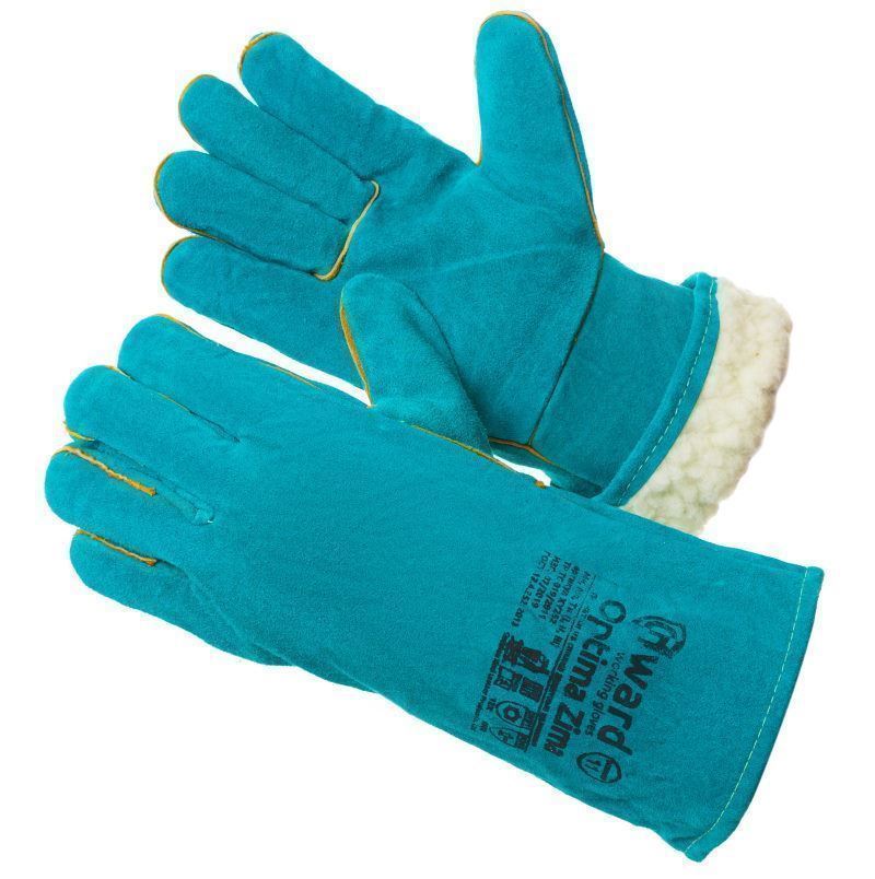 Экономичные цельноспилковые зимние сварочные краги. Сшиты из спилка КРС зеленого цвета толщиной 1мм, утеплены искусственным мехом типа "овчина"