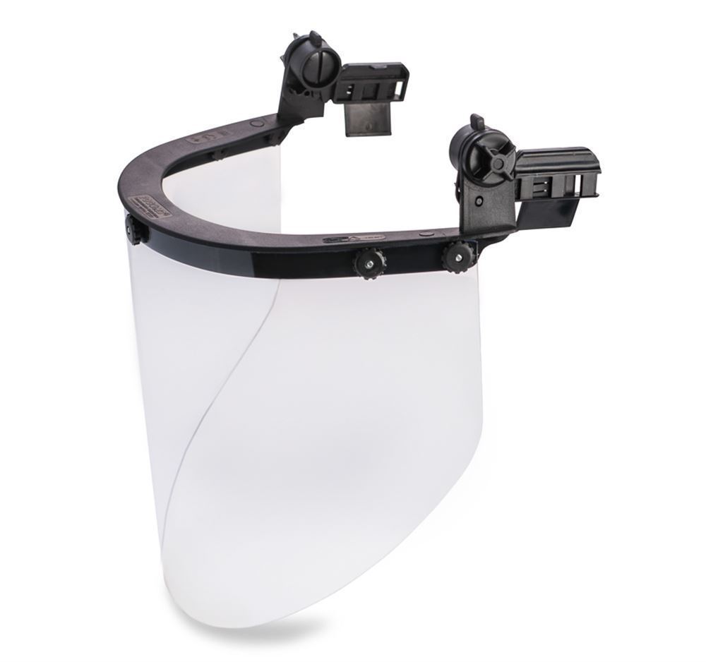 Щиток с креплением на каске с экраном из поликарбоната толщиной 2 мм (220х385мм) для работ у доменных, сталеплавильных и других промышленных, нагревательных печей, для защиты от искр брызг металла, химических веществ, летящих частиц с высокоэнергетическим ударом, абразивов и высокой температуры. Универсальное накасочное крепление PARTNER, универсальные адаптеры на все каски РОСОМЗ.